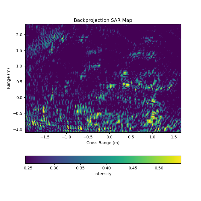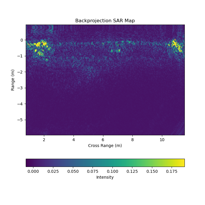 Once we had developed a method for plotting our radar returns, we focused on creating synthetic aperture radar maps. Synthetic aperture radar (SAR) is a technique used to increase resolution by overlaying multiple scans of the same target area. The same effect can be achieved by making your radar aperture far larger, so in some sense you're creating a synthetic aperture by moving the radar. To create our images, we flew the radar on drones in MIT's high bay. We then used a system of infrared tracking cameras to get position data on the drone, and lined it up with our scan. We then combined the motion capture and radar data to form our own maps, generally of aluminum soda cans placed on the floor.