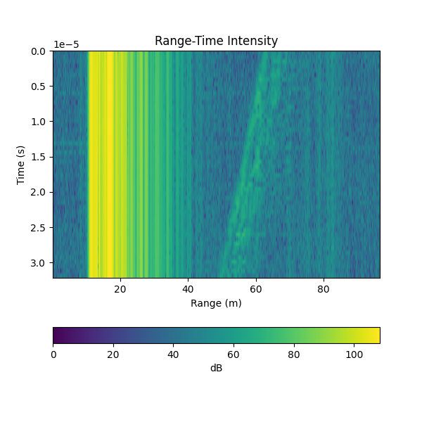 Figure 1-2. Range-time intensity plot dipicting an an object that starts 60m away and moves to 50m over 3 seconds