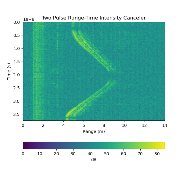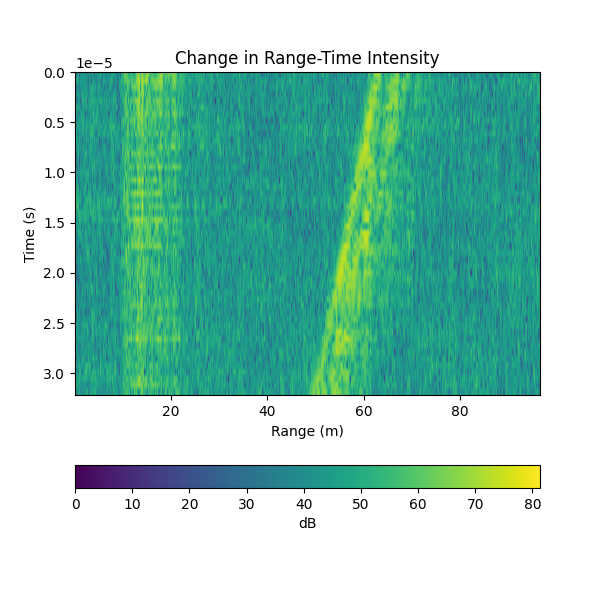We noticed it could be difficult to make out small objects or objects at far distances due to the radar's limited power, so we also created delta range-time intensity plots, which subtract two adjacent pulses to find the differences between them. Along with making motion easier to see, these plots had the added benefit of reducing the large initial pulse detected by the receiving antenna as the radar is transmitting.