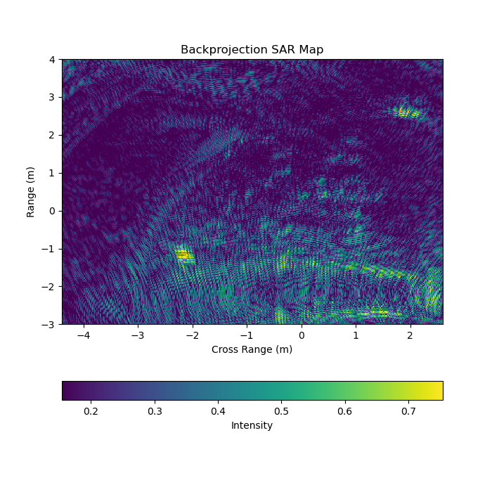 Once we had developed a method for plotting our radar returns, we focused on creating synthetic aperture radar maps. Synthetic aperture radar (SAR) is a technique used to increase resolution by overlaying multiple scans of the same target area. The same effect can be achieved by making your radar aperture far larger, so in some sense you're creating a synthetic aperture by moving the radar. To create our images, we flew the radar on drones in MIT's high bay. We then used a system of infrared tracking cameras to get position data on the drone, and lined it up with our scan. We then combined the motion capture and radar data to form our own maps, generally of aluminum soda cans placed on the floor.